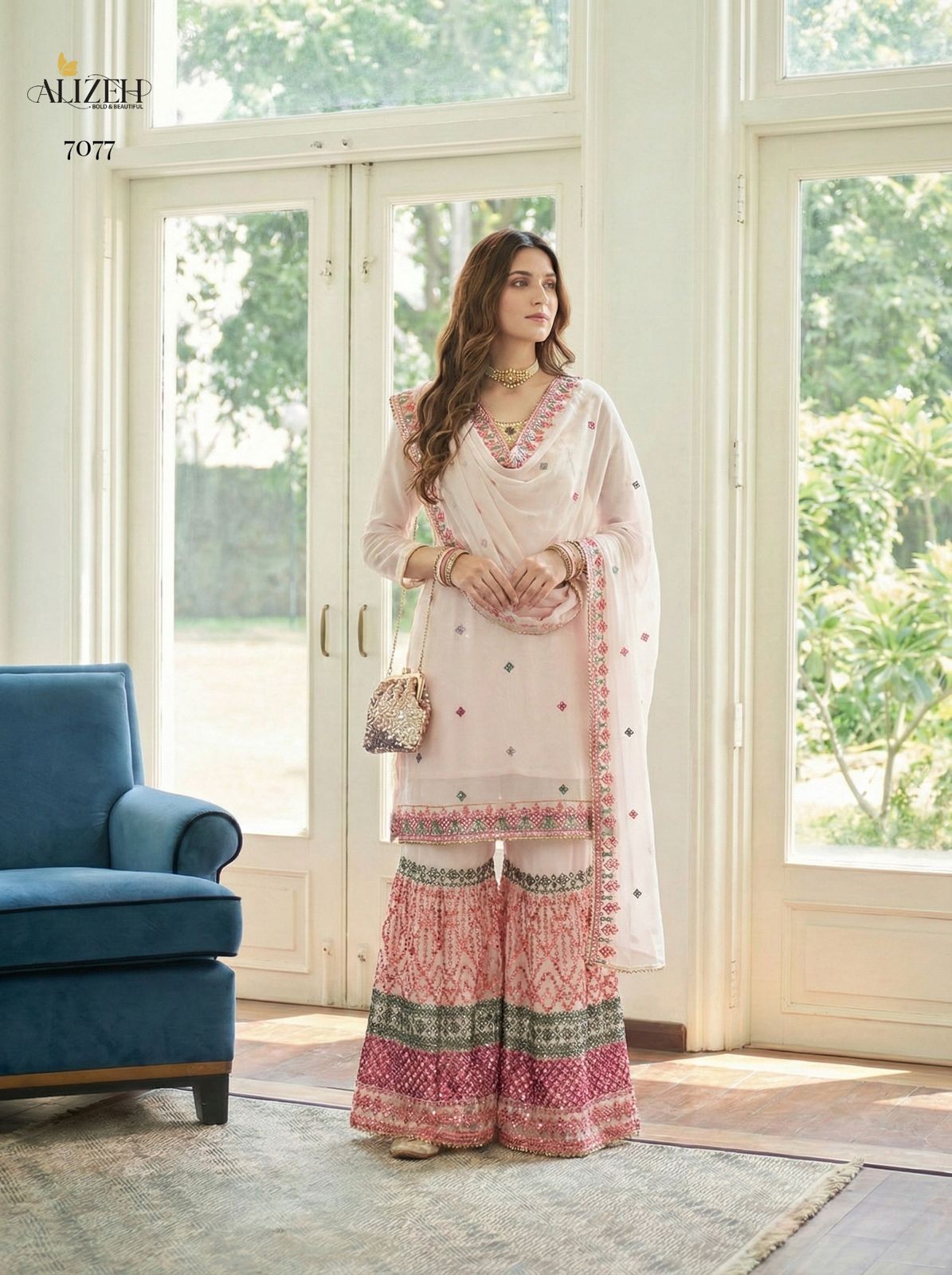 - Premium Real Georgette (Heavy Look Embroidered Top with Hand Seroski, Embroidered Palazzo, Embroidered Dupatta)
