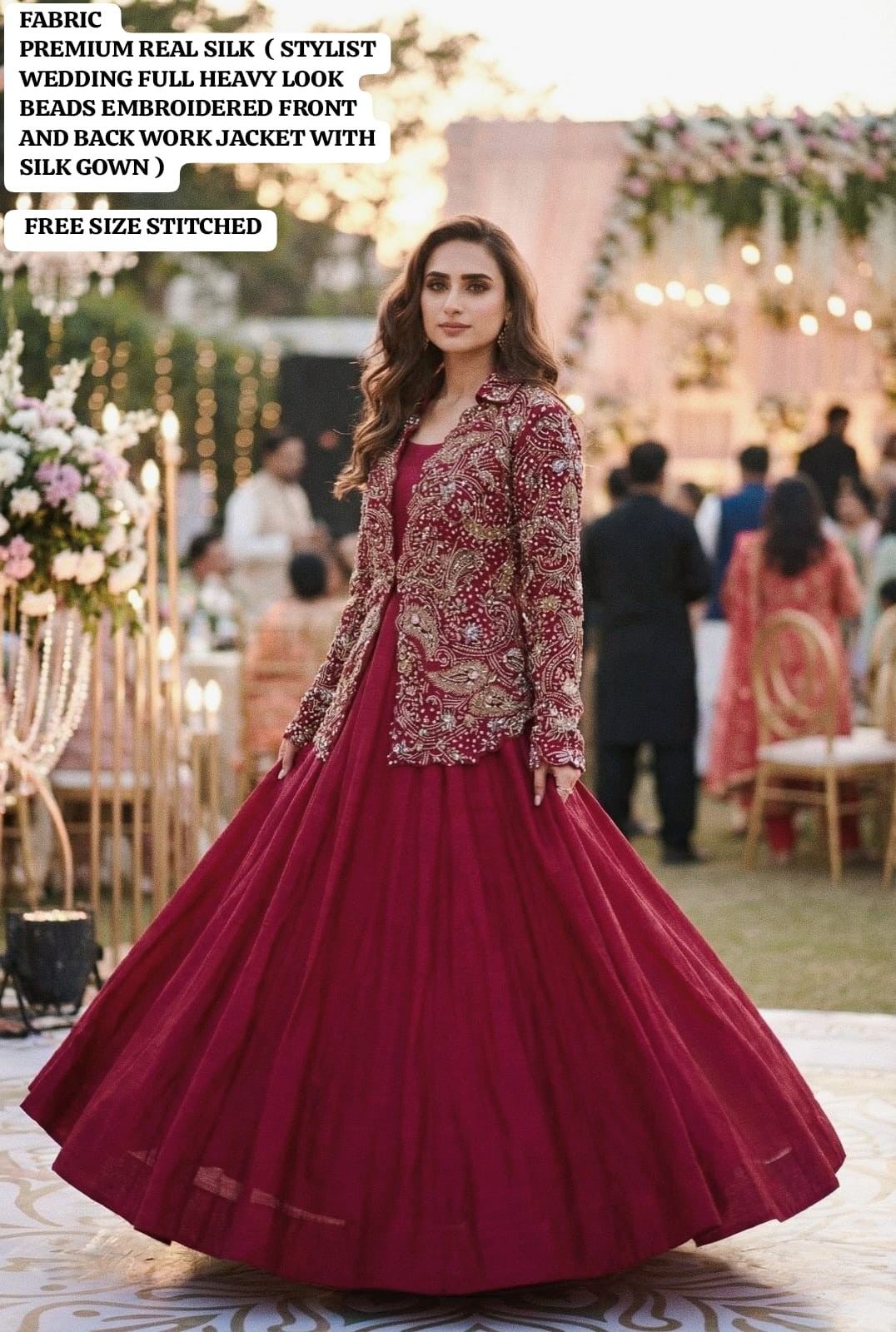 - Work: Stylist Wedding Full Heavy Look Beads Embroidered Front And Back Work Jacket With Silk Gown