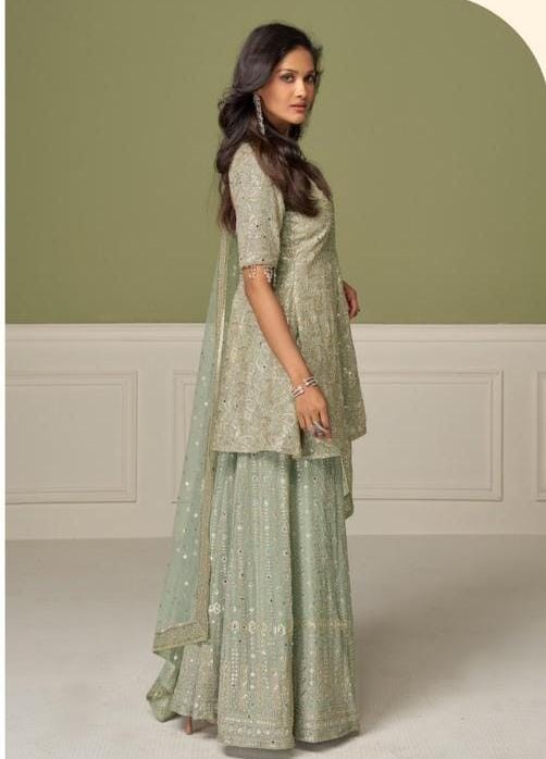 Premium Real Georgette (Heavy Look Embroidered Top with Hand Seroski, Embroidered Palazzo, Embroidered Dupatta)