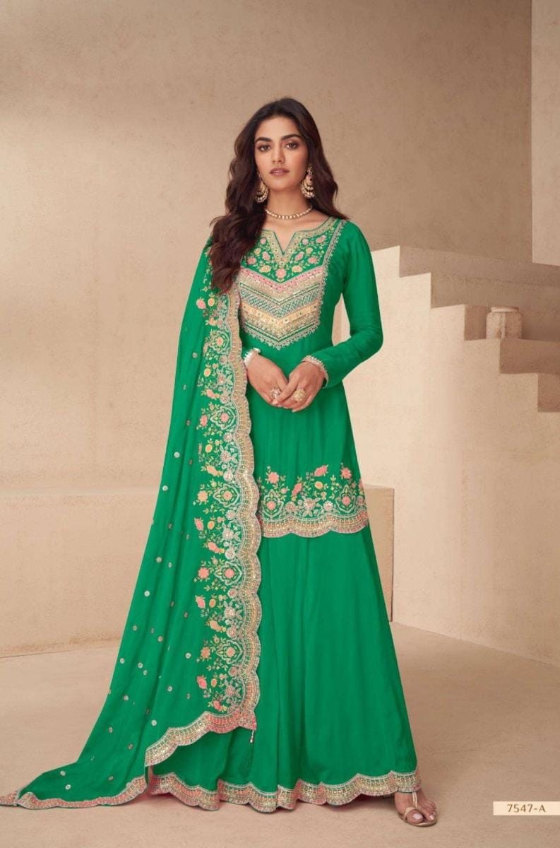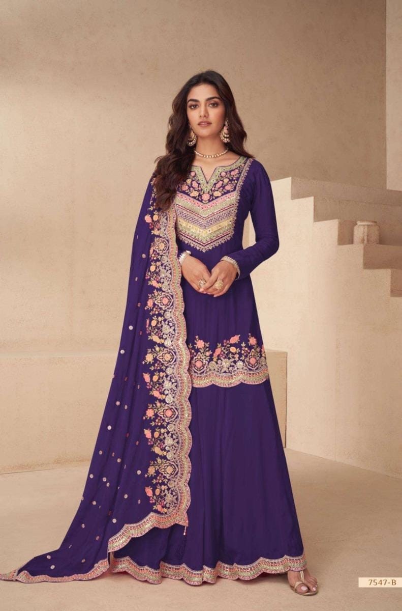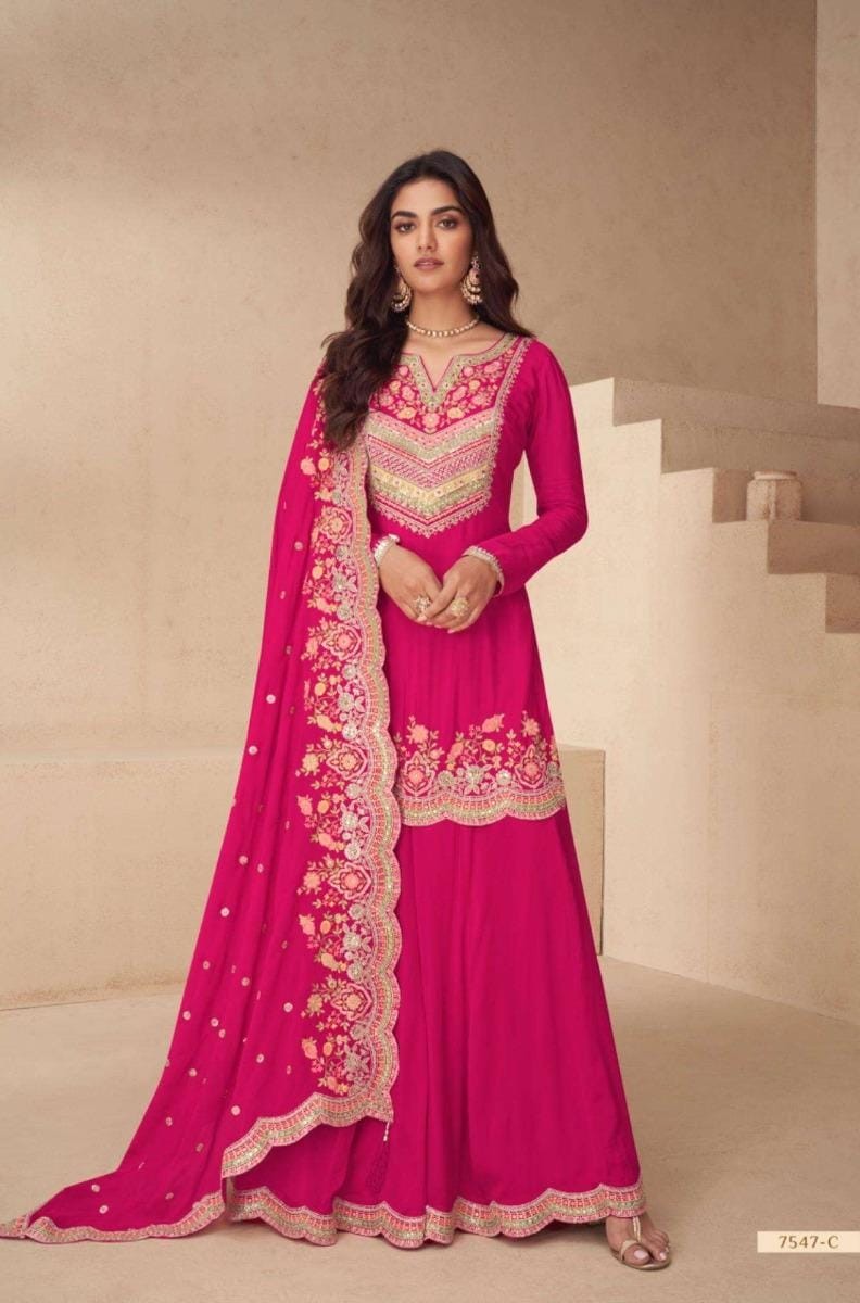 Top: Real Chinon | Dupatta: Real Chinon | Plazoo: Real Chinon | Note: Embroidery Work Only