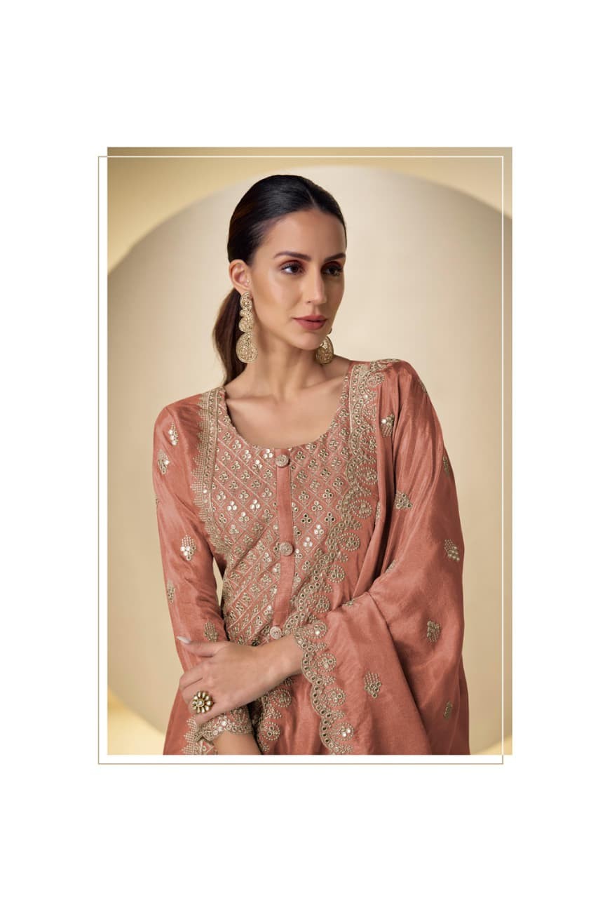 - Premium Real Chinnon Silk (Heavy Look Embroidered Top with Hand Mirror Work, Embroidered Palazzo, Embroidered Net Dupatta)
