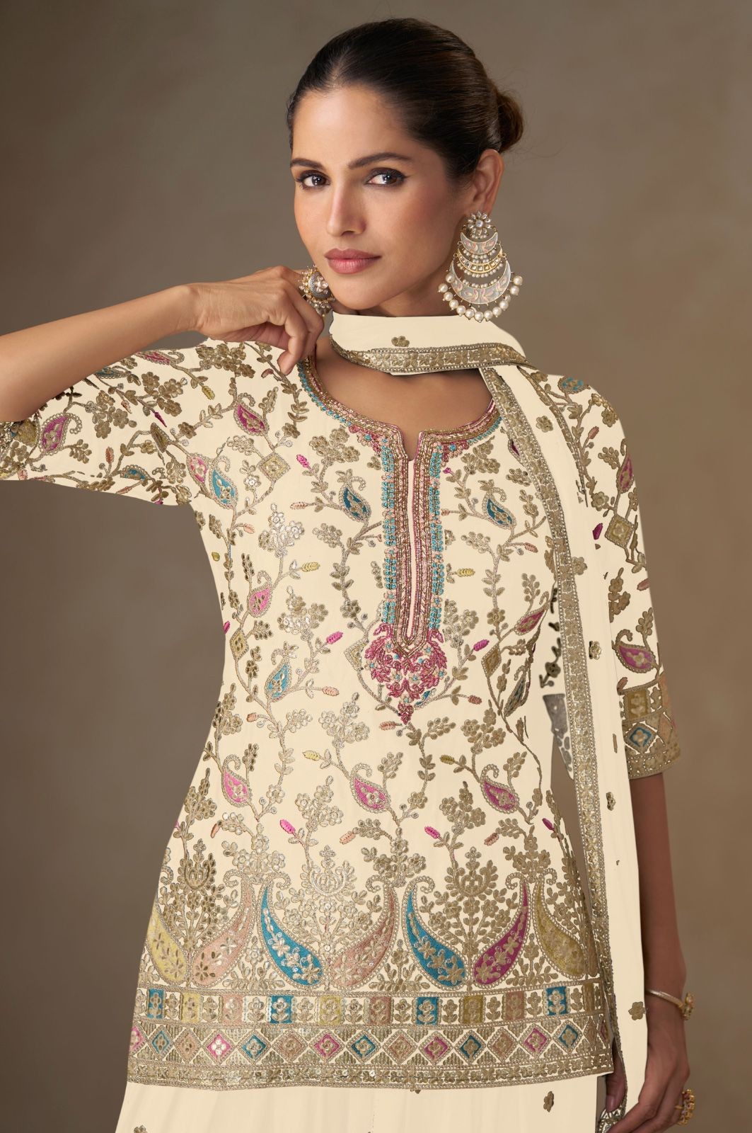 Premium Real Georgette (Heavy Look Embroidered Top with Hand Seroski, Embroidered Palazzo, Embroidered Dupatta)