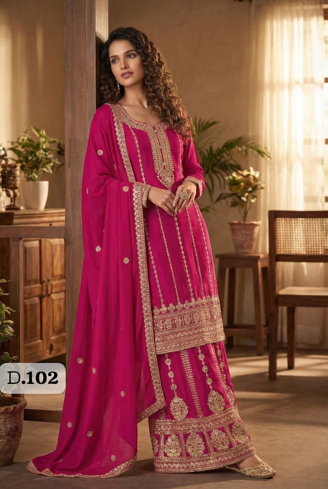 - Premium Real Chinnon Silk / Premium Silk (Heavy Look Embroidered Chinnon Silk Top with Front and Back Embroidered Sharara, Embroidered Dupatta)