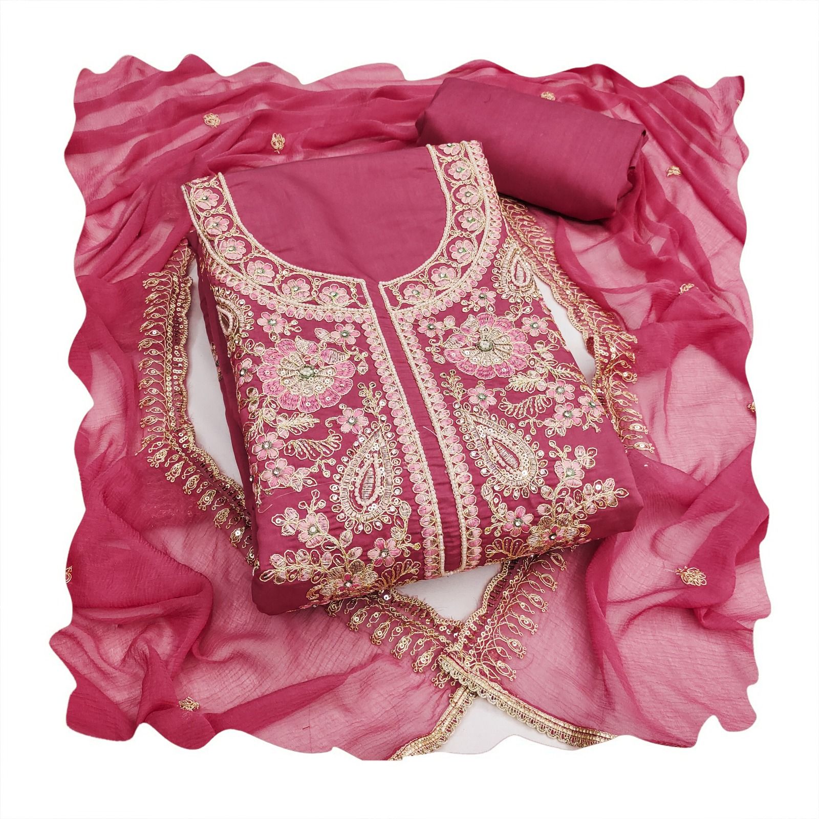 - Premium Real Chinnon Silk (Heavy Look Multi Threads Handwork Embroidered Front and Back Gown with Embroidered Organza Dupatta)