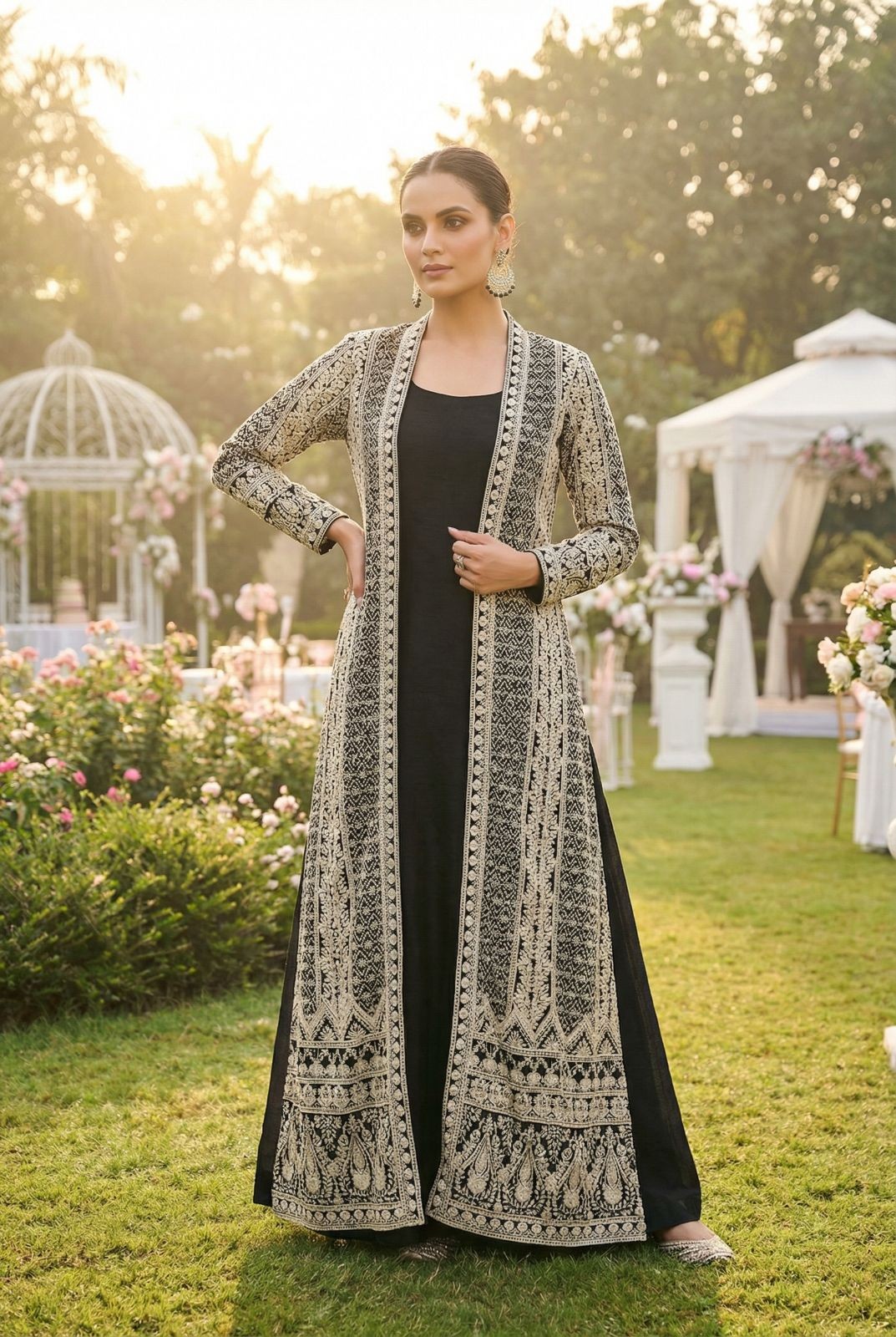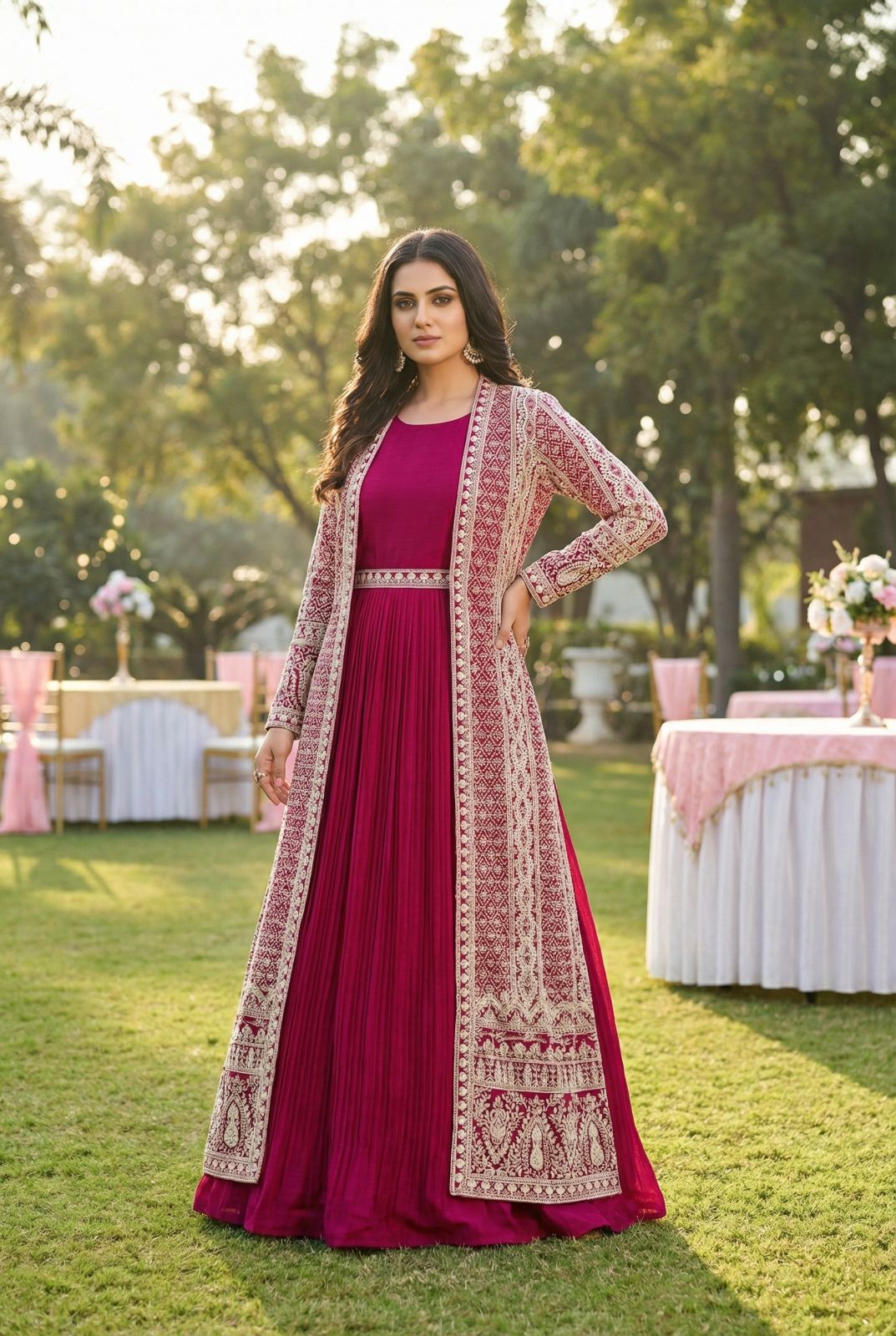 Work: Front And Back Heavy Embroidered Jacket With Belt And Chiffon Silk Gown