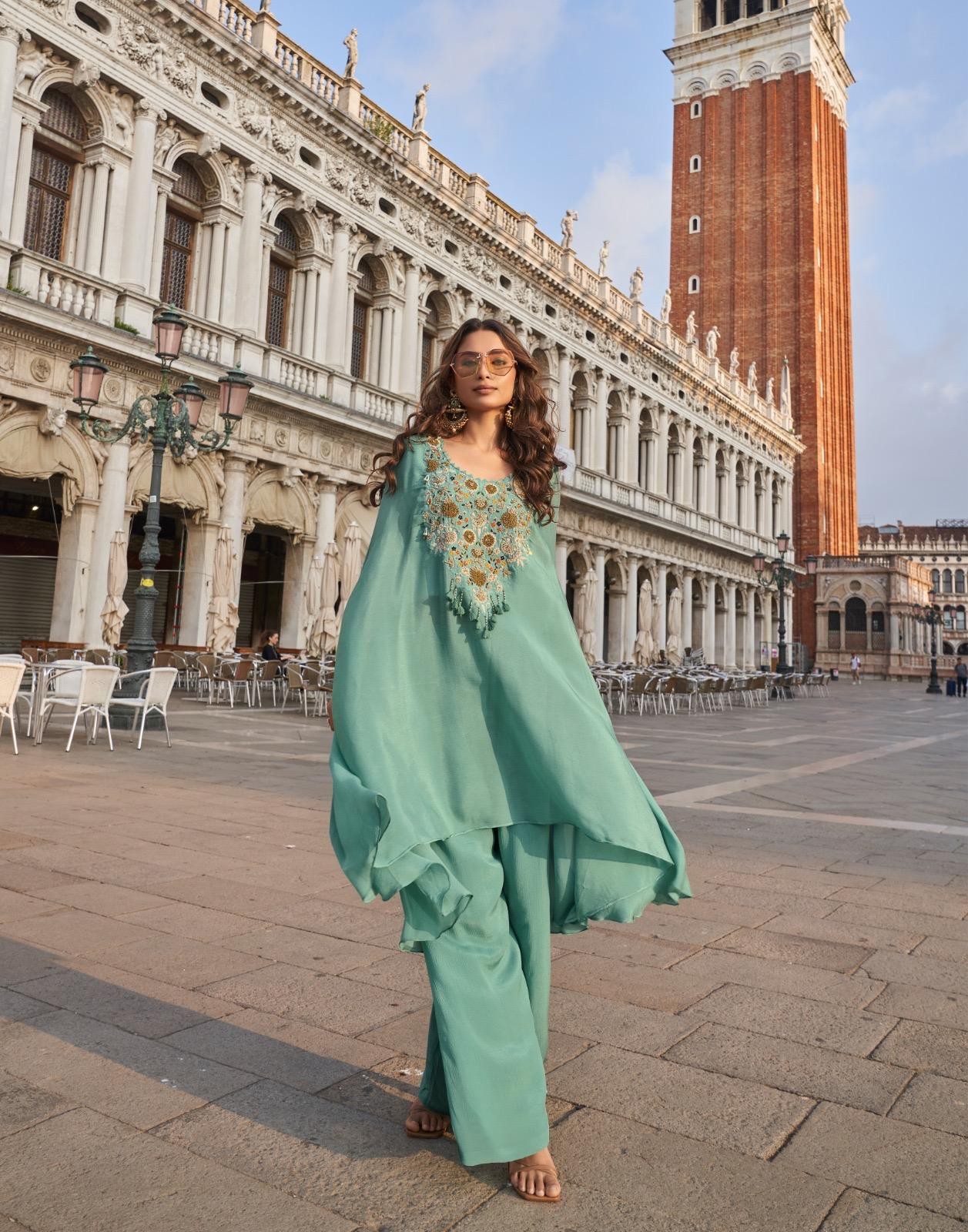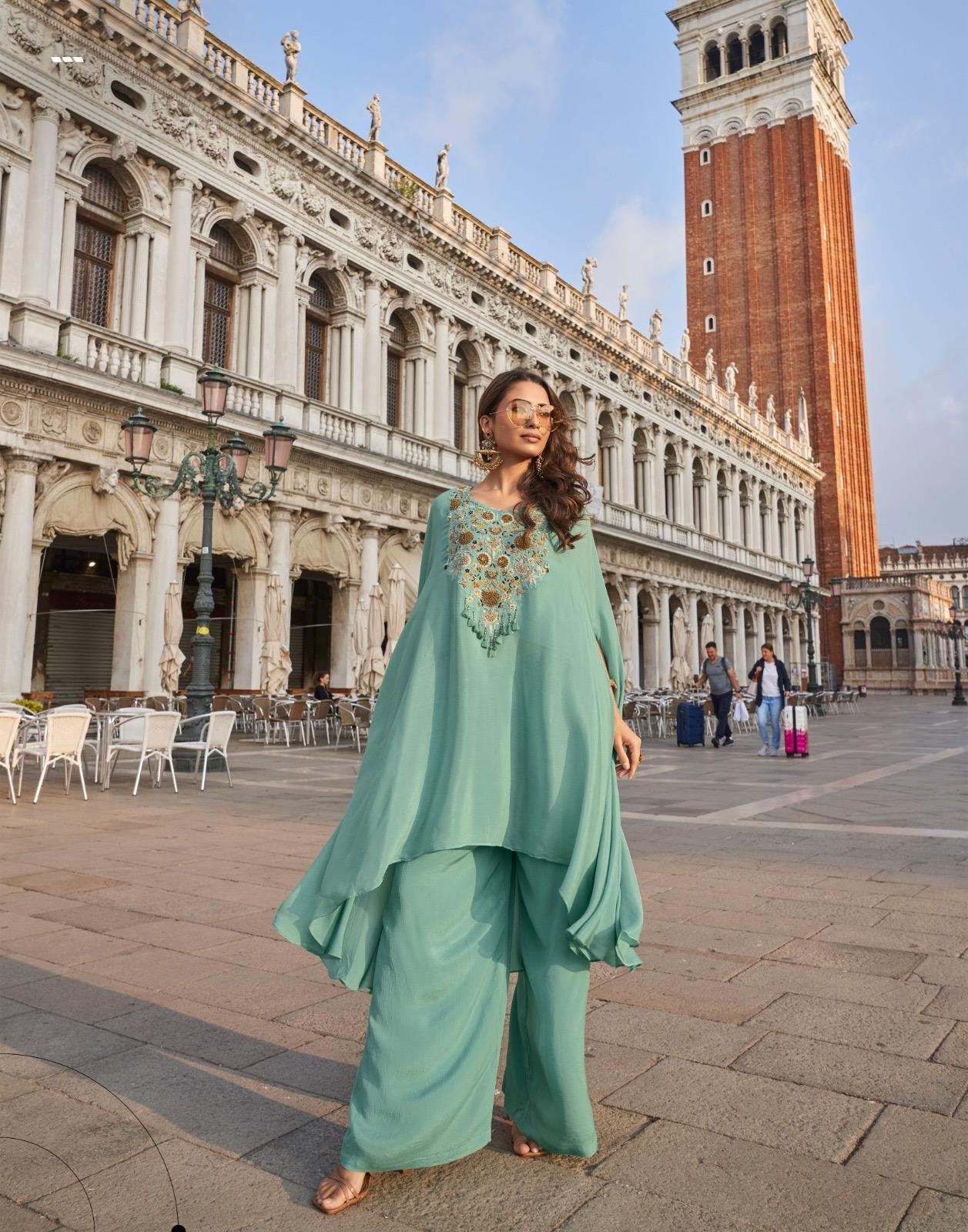 Premium French Crep Silk / Real Chinon Silk Hand Embroidered Long Cut Style Top With Plazzo