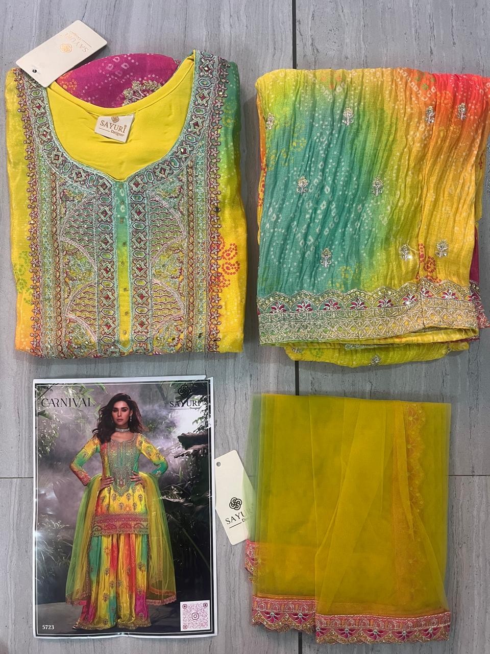 - Premium Real Chinnon Silk / Premium Silk (Heavy Look Embroidered Chinnon Silk Top with Front and Back Embroidered Sharara, Embroidered Dupatta)