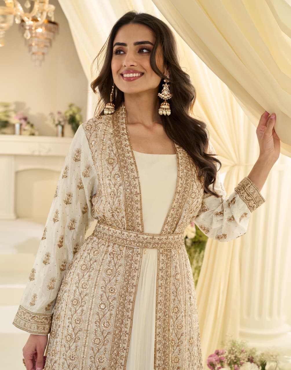 Work: Trendy Festive Look Front And Back Heavy Embroidered Jacket With Belt And Chiffon Silk Gown