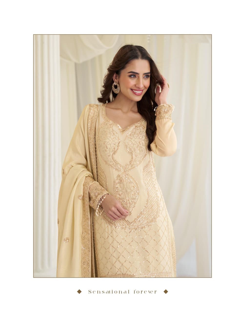 Premium Real Chinnon Silk (Heavy Look Embroidered Top with Hand Mirror Work, Embroidered Palazzo, Embroidered Net Dupatta)