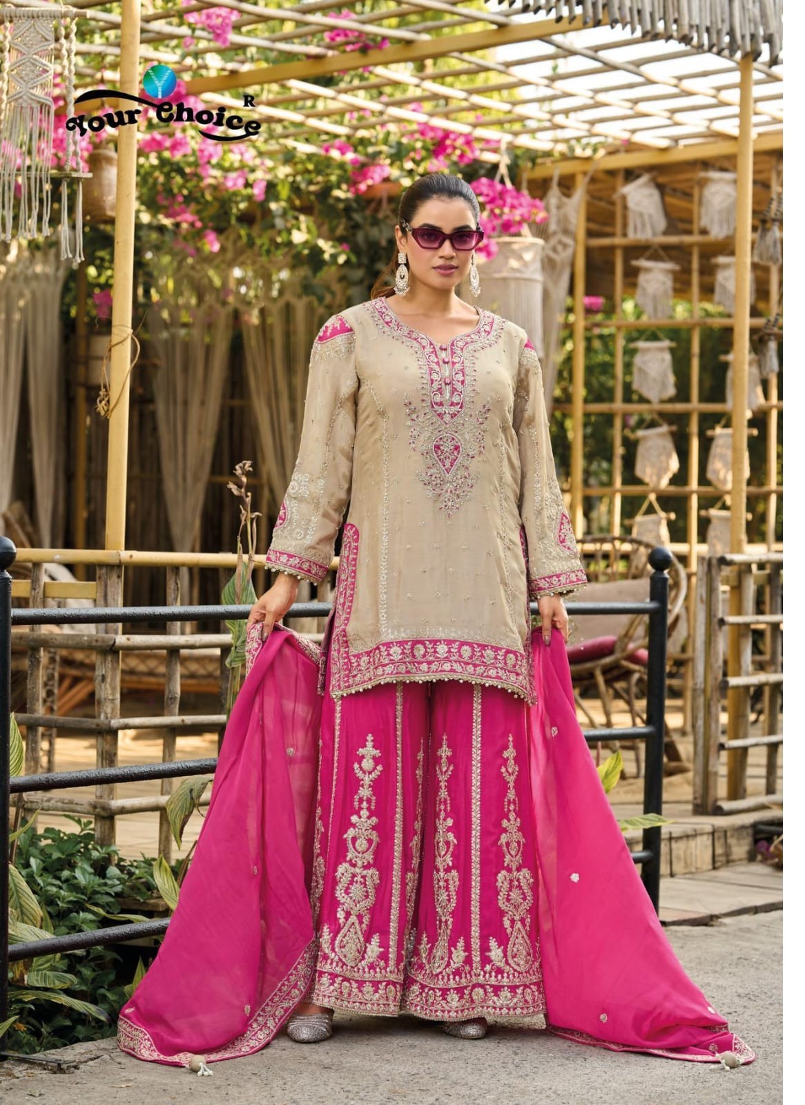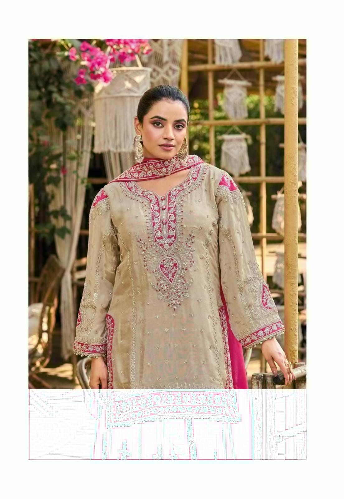 - Premium Real Chinnon Silk (Heavy Look Embroidered Top with Hand Mirror Work, Embroidered Palazzo, Embroidered Net Dupatta)